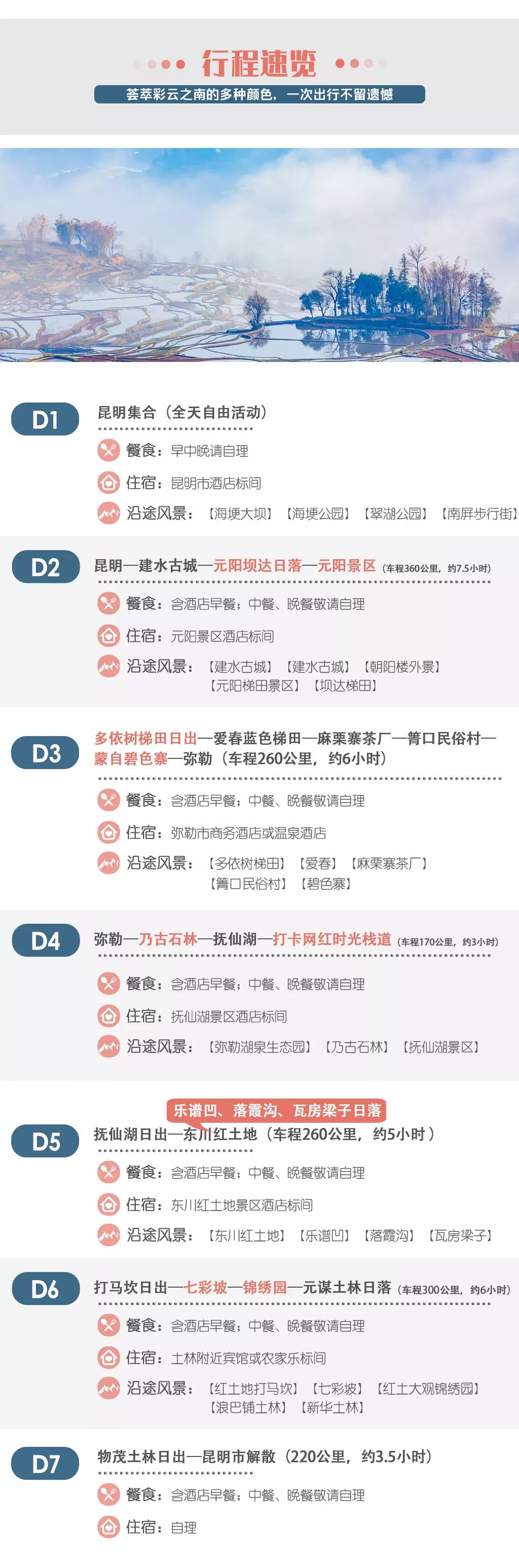 當日行程:早晨出發前往【紅土地打馬坎】觀賞磅礴日出,之后到達【七彩坡】、【紅土大觀錦繡園】進行拍攝;