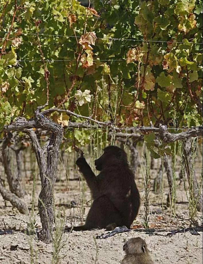 和托斯卡納暴殄天物的野豬相比,南非開普敦的狒狒顯然有著更挑剔的品味。隨著葡萄酒業(yè)的興盛,當(dāng)?shù)蒯翎襞c時俱進(jìn),發(fā)展出了新潮的昂貴品味——吃葡萄。當(dāng)?shù)厝松踔量偨Y(jié)出了經(jīng)驗(yàn):狒狒最愛吃黑皮諾和霞多麗,它們能辨別出最甜美的果實(shí),只把自己看不上的酸澀葡萄留給釀酒師。