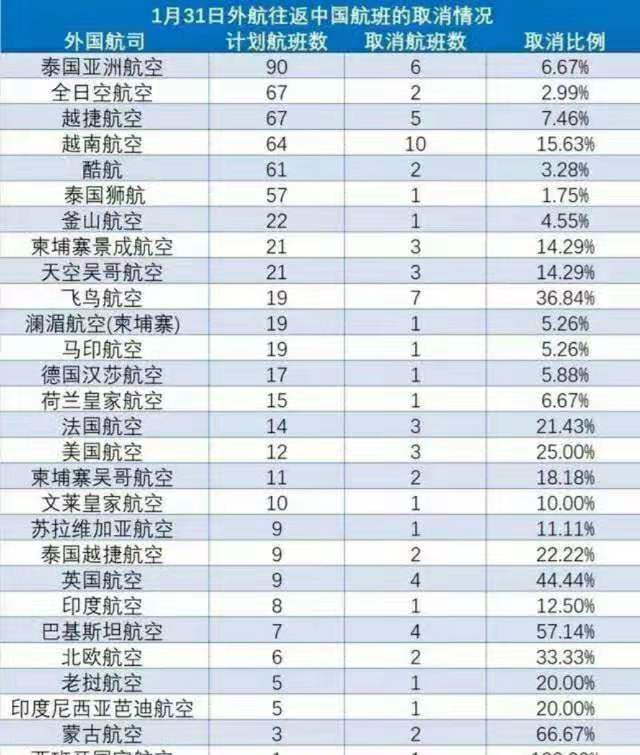 1月31日,120家國(guó)際航司計(jì)劃執(zhí)行1838個(gè)中國(guó)國(guó)際航班,其中28家航空公司共取消72個(gè)中國(guó)國(guó)際航班。