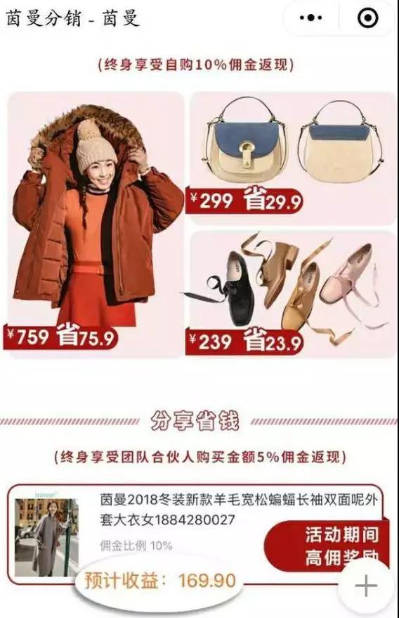從淘寶電商起家的茵曼反應更為迅速,疫情爆發后聯動了600多家門店開展社群營銷,利用小程序、朋友圈、微信群等方式,引導顧客消費。此外,茵曼對外招募了1萬名“茵曼推手”。只需在茵曼小程序掃碼下單滿100元,便可成為“茵曼推手”,有效期為180天,“推手”們可享受最高達實付金額20%的推廣傭金。