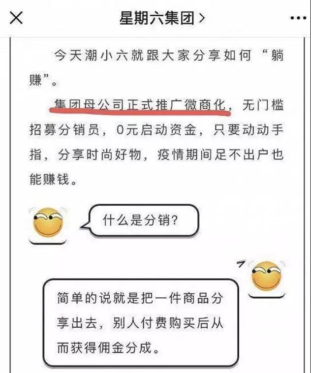 星期六股份有限公司宣布:“集團母公司正式推廣微商化,無門檻招募分銷員,0元啟動資金,只要動動手指,分享時尚好物,疫情期間足不出戶也能賺錢。”
