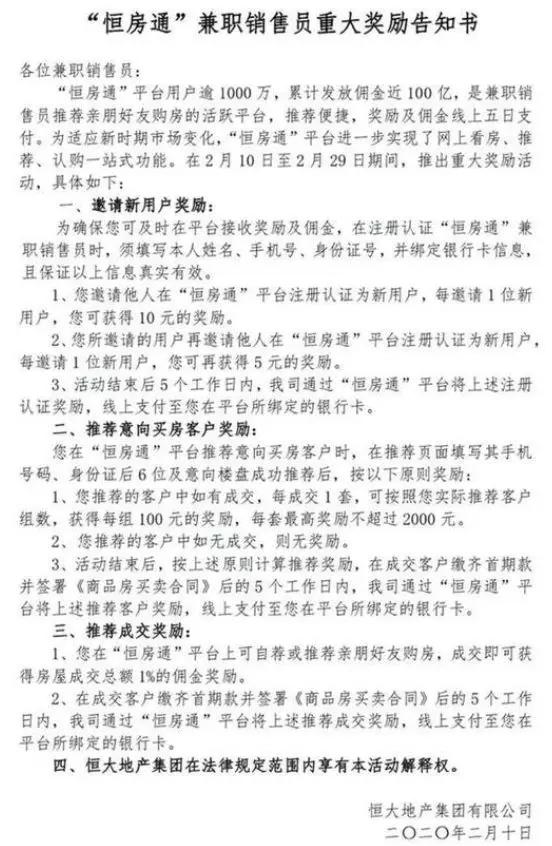 恒大“75折優惠”線上營銷,讓疫情之下房企的線上賣房模式受到關注。2月10日,恒房通上線分銷激勵,針對自購、推薦他人購買、第三方購買、推薦新客戶等不同情況,推出了不同傭金及獎勵,比如說推薦別人購買的,不僅定金全額返還,并可獲1%傭金及1萬元獎勵。