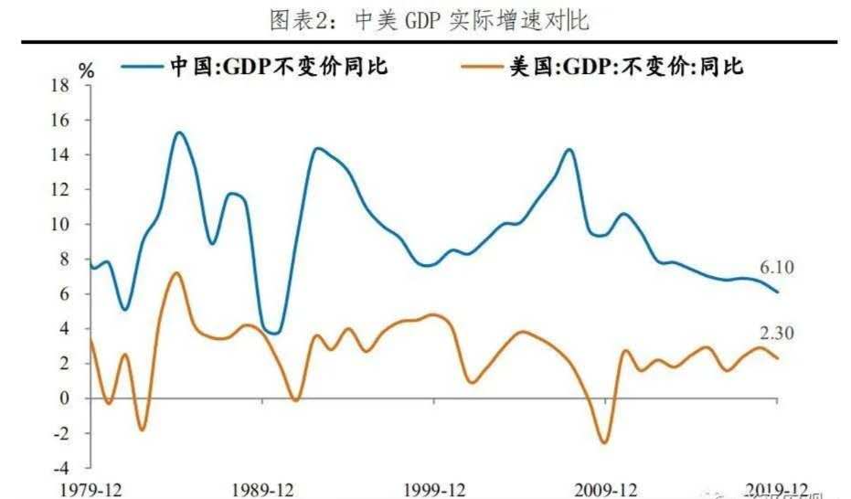 2019年中國GDP規模達99萬億元,相當于14.4萬億美元,而美國2019年GDP為21.4萬億美元,中國GDP相當于美國的約67%,中美差距正在快速縮小。2019年中國GDP實際增速6.1%,低于1978-2008年高速增長期的平均增速9.8%,但仍遠高于美國2019年增速2.3%。據IMF估計,2019年全球GDP總量達86.6萬億美元,其中中國和美國占全球GDP比重分別為16.6%和24.7%,第三大經濟體日本占全球GDP比重僅5.7%,中美主導全球。