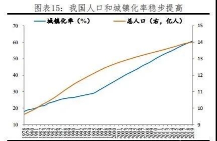 2019年城鎮化率達60.60%,比上年末提高1.02個百分點,保持穩步增長態勢,較高收入經濟體的81.3%仍有20個百分點的空間。過去四十年,中國城鎮常住人口從1.7億快速增至8.5億,凈增加6.8億,城鎮化率從17.9%提升至60.6%,提高43個百分點,深刻地改變了中國經濟社會格局,成就了過去中國重化工業、大規模基礎設施投資、房地產、消費升級等的飛速發展。