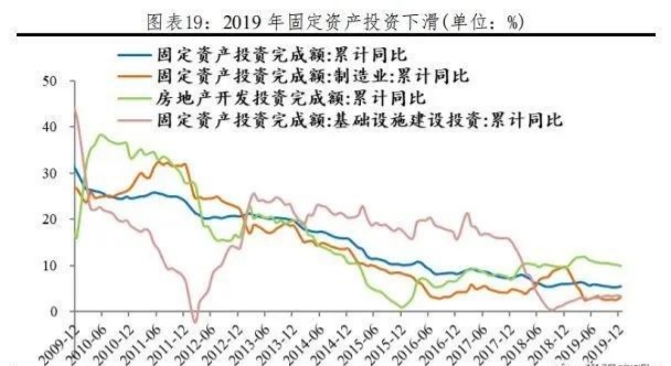 2019年全社會固定資產投資名義同比增長5.1%,較上年回落0.8個百分點。分地區來看,東部、中部和西部地區投資分別增長4.1%、9.5%和5.6%,東北地區投資下降3.0%,中西部持續接納東部轉移產業。分行業看,房地產投資是主要支撐但總體放緩、制造業投資整體低迷,基建投資反彈乏力。2019年房地產投資同比9.9%,較2018年回升0.4個百分點,是投資最主要的支撐力量,但年內增速持續放緩;基建(含水電燃氣)投資同比3.3%,較2018年提高1.7個百分點,但仍處于低位;制造業投資同比3.1%,較2018年下滑6.4個百分點。同時,民間固定資產投資同比4.7%,較2018年下滑4.0個百分點。