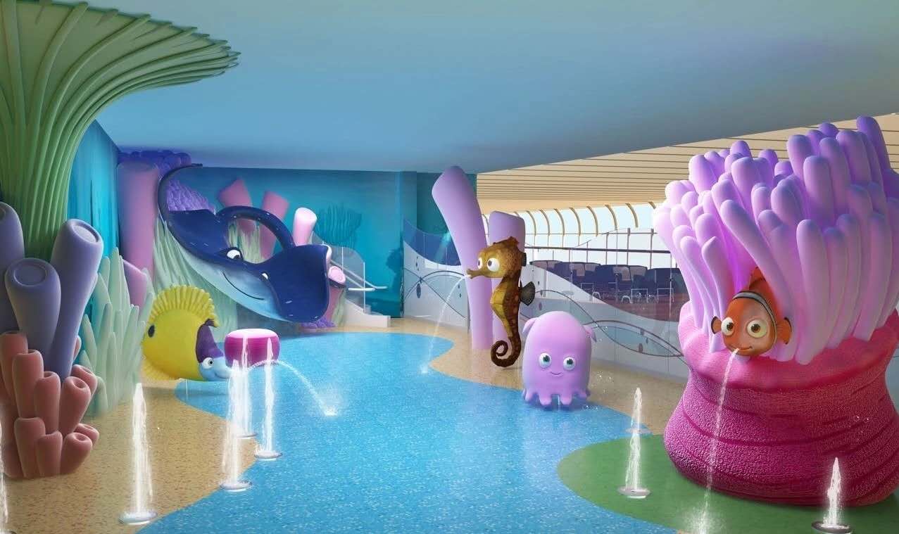 孩子們可以在尼莫(小丑魚)的珊瑚礁海灘上休息一下,這是由玻璃圍墻包圍,1500平方英尺,柔軟的濕甲板表面區域的完美的海灘,迷你水游戲區,一個有趣的水上樂園,里面有迪斯尼電影《海底總動員》里的水下角色。