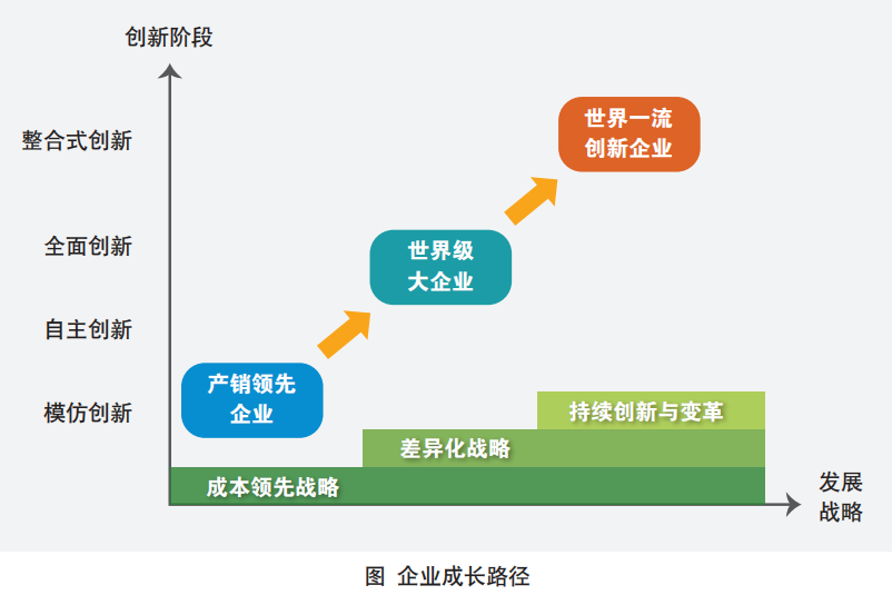 戰略選擇對于企業未來可以走到的位置有著決定性作用,企業不同成長階段分別對應不同的發展戰略。成本領先戰略和差異化戰略只能幫助企業成為大企業,唯有不斷創新才能幫助企業成為世界一流創新企業。