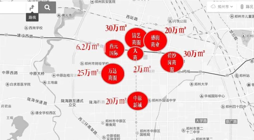 鄭州市中原區單單幾個大型商業中心的體量之和已經突破130萬㎡。再加上約50萬㎡的社區底商,保守估計一下——