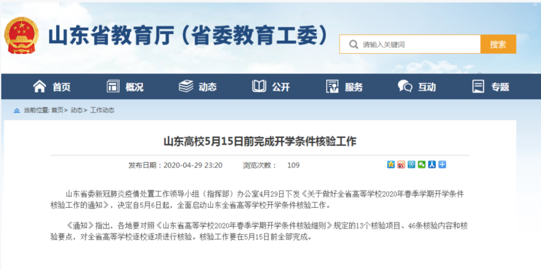 據山東省教育廳4月29日消息,山東省委新冠肺炎疫情處置工作領導小組(指揮部)辦公室4月29日下發《關于做好全省高等學校2020年春季學期開學條件核驗工作的通知》,決定自5月6日起,全面啟動山東全省高等學校開學條件核驗工作。