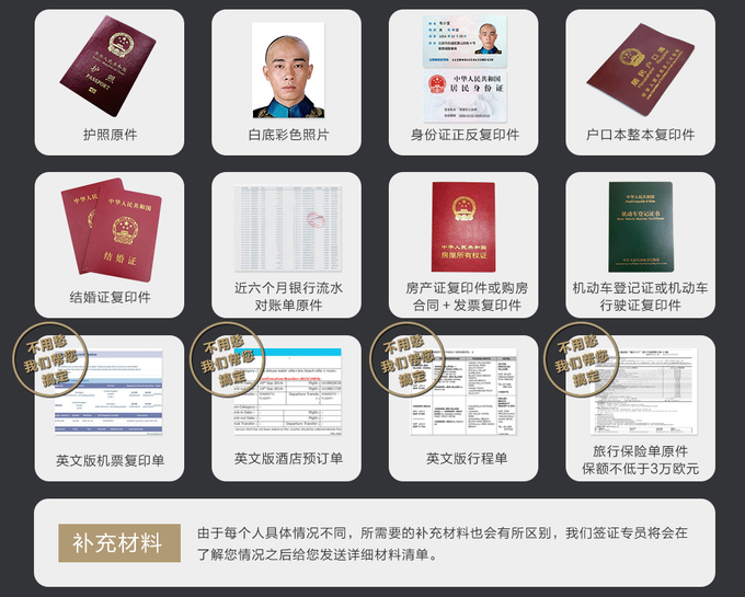 辦理申根簽證所需材料的繁瑣全球數一數二,中國大陸因私護照、2寸白底照片、身份證復印件、戶口本復印件(每一頁)、婚姻證明、銀行流水、財產證明、出行證明、境外醫療保險等。