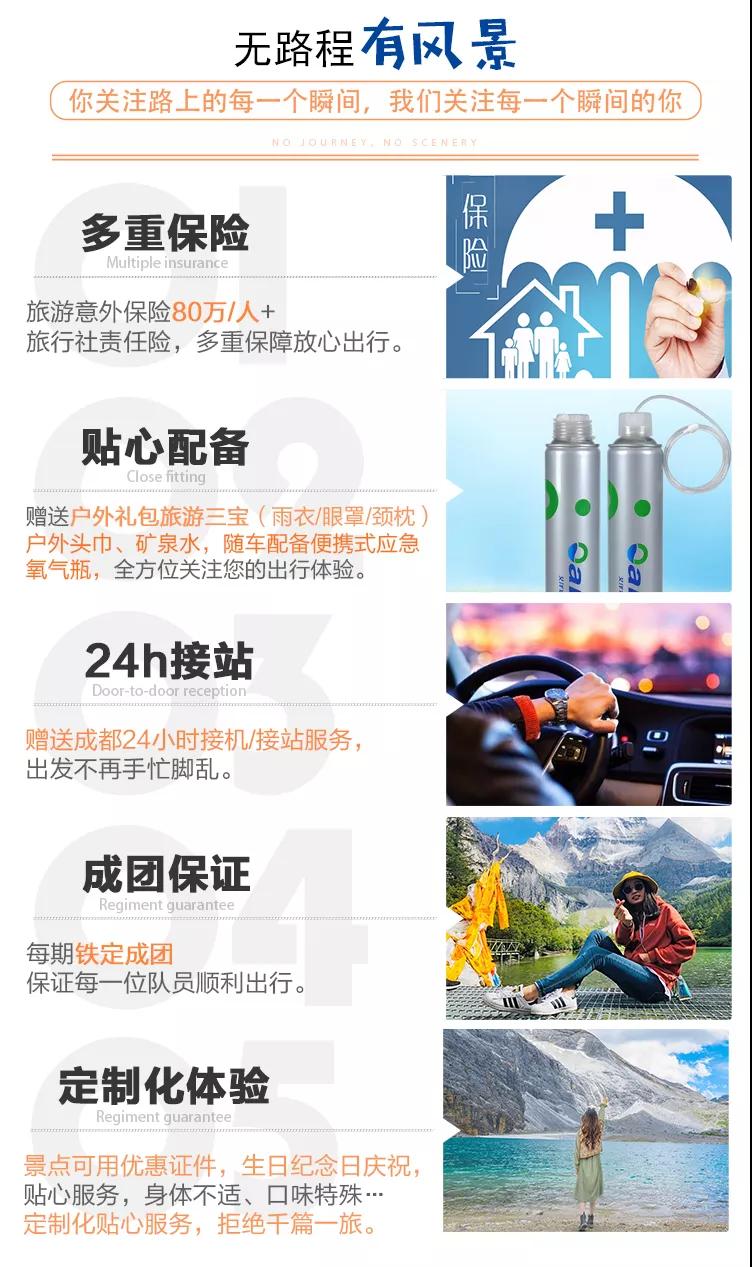 保險:贈送旅游意外保險,旅游意外保險最高賠付80萬元/人(外賓另議),購買旅行社責任險;保險不含財產險,請游客保管好自己的財物;因旅行意外造成的客人意外傷害,按保險公司規定賠償,我方不承擔另外的賠償責任;如游客有需要可自行購買其他保障險。贈送:贈送旅行三寶(雨衣眼罩和頸枕),緩解旅途疲勞;隨車配備便攜式應急氧氣瓶;贈送成都24h接機接站服務。贈送項目不用費用不退。