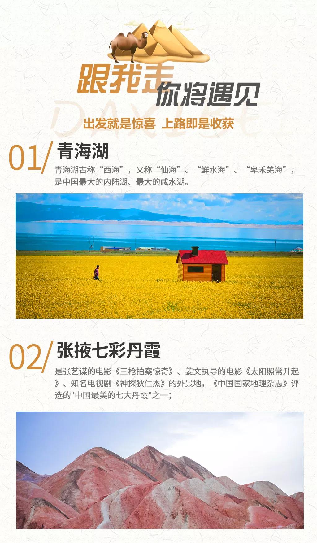 西北地區(qū)天氣干燥,旅途的過程中請大家多喝水,注意防曬;敦煌《又見敦煌》演出,旅游淡季298元/人,旺季368元/人起;果木烤全羊費(fèi)用根據(jù)羊的大小決定,由參與活動的游客均攤,一般10人一桌,人均消費(fèi)160元左右。