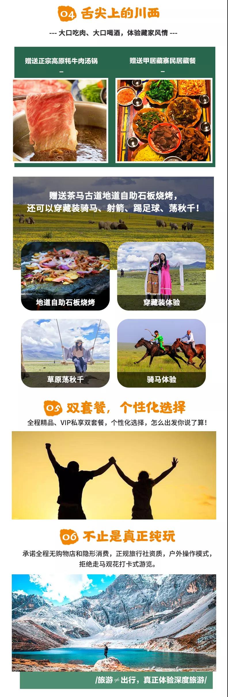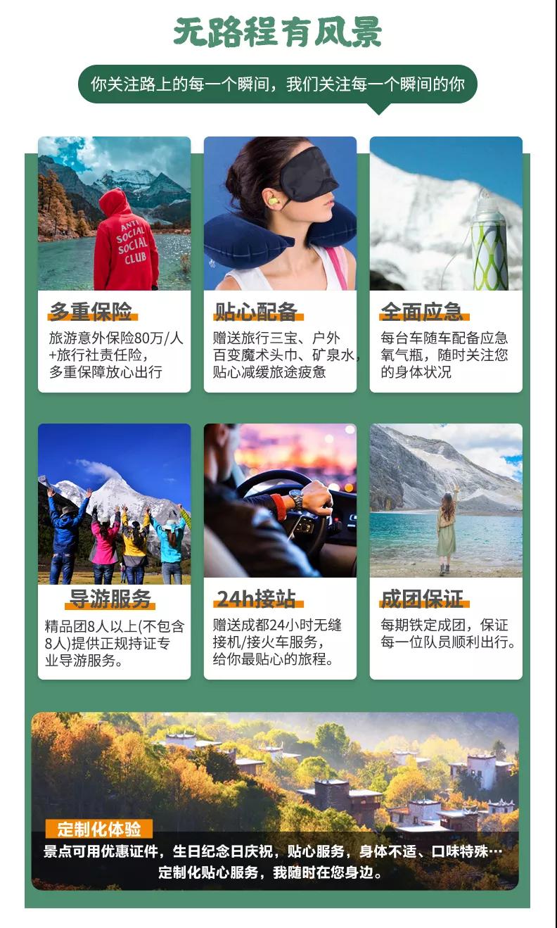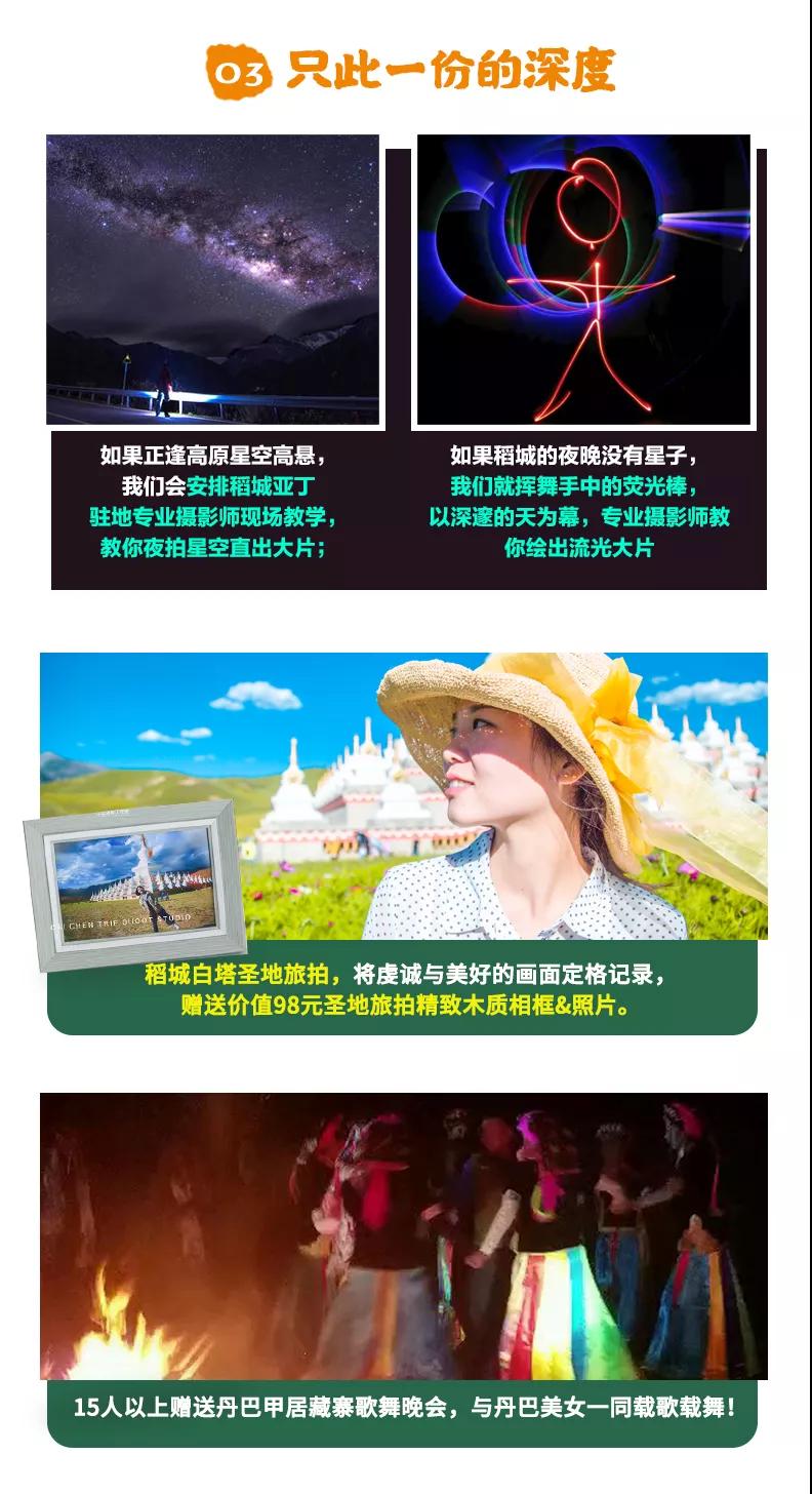 贈送:特色贈送甲居藏寨藏家晚餐、高原特色牦牛湯鍋、理塘茶馬古道自助石板燒烤;贈送旅游三寶、魔術(shù)頭巾、礦泉水緩解旅途疲勞;贈送價值98元圣地旅拍精致木質(zhì)相框&照片;贈送稻城專業(yè)攝影師現(xiàn)場教學(xué)夜拍星空直出大片,沒有星星時則教拍流光大片;15人以上贈送甲居藏寨篝火晚會;贈送成都市區(qū)24小時接機(jī)/接火車服務(wù);贈送項目不用不退。