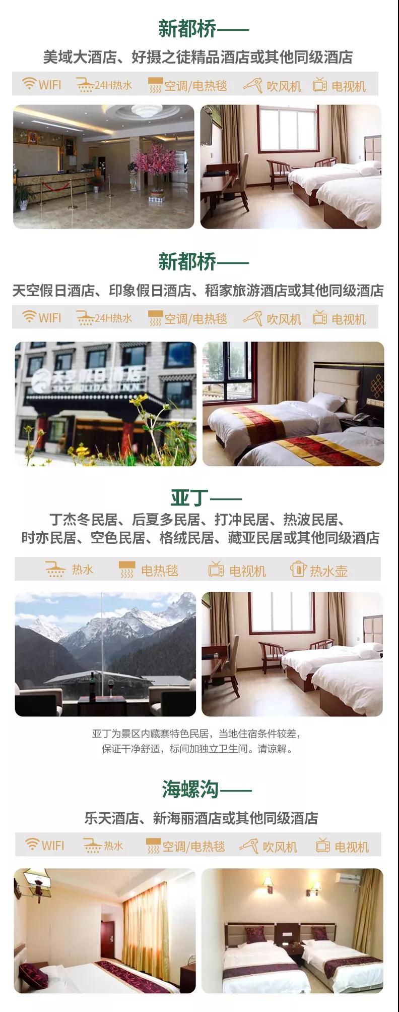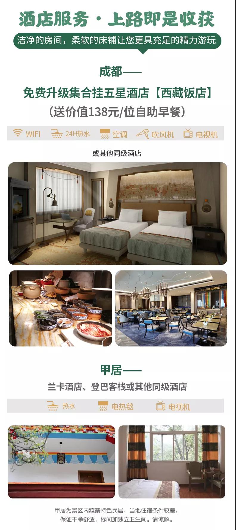 住宿:6晚當(dāng)?shù)鼐肪频觌p人標(biāo)間+免費(fèi)升級一晚成都集合掛五酒店雙人標(biāo)間,確保酒店干凈衛(wèi)生,溫馨舒適。因沿途高原藏區(qū)條件有限,如果酒店設(shè)施沒有達(dá)到您的期望,敬請諒解。參考酒店如下: