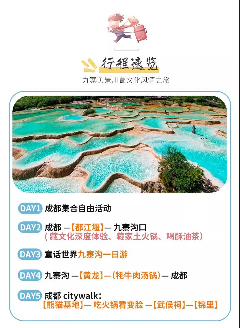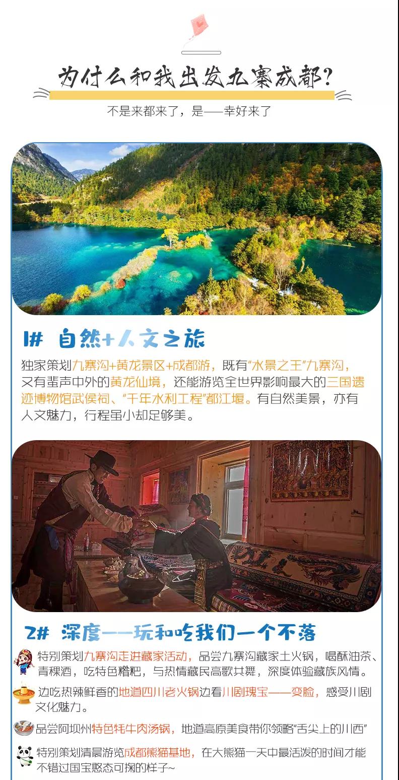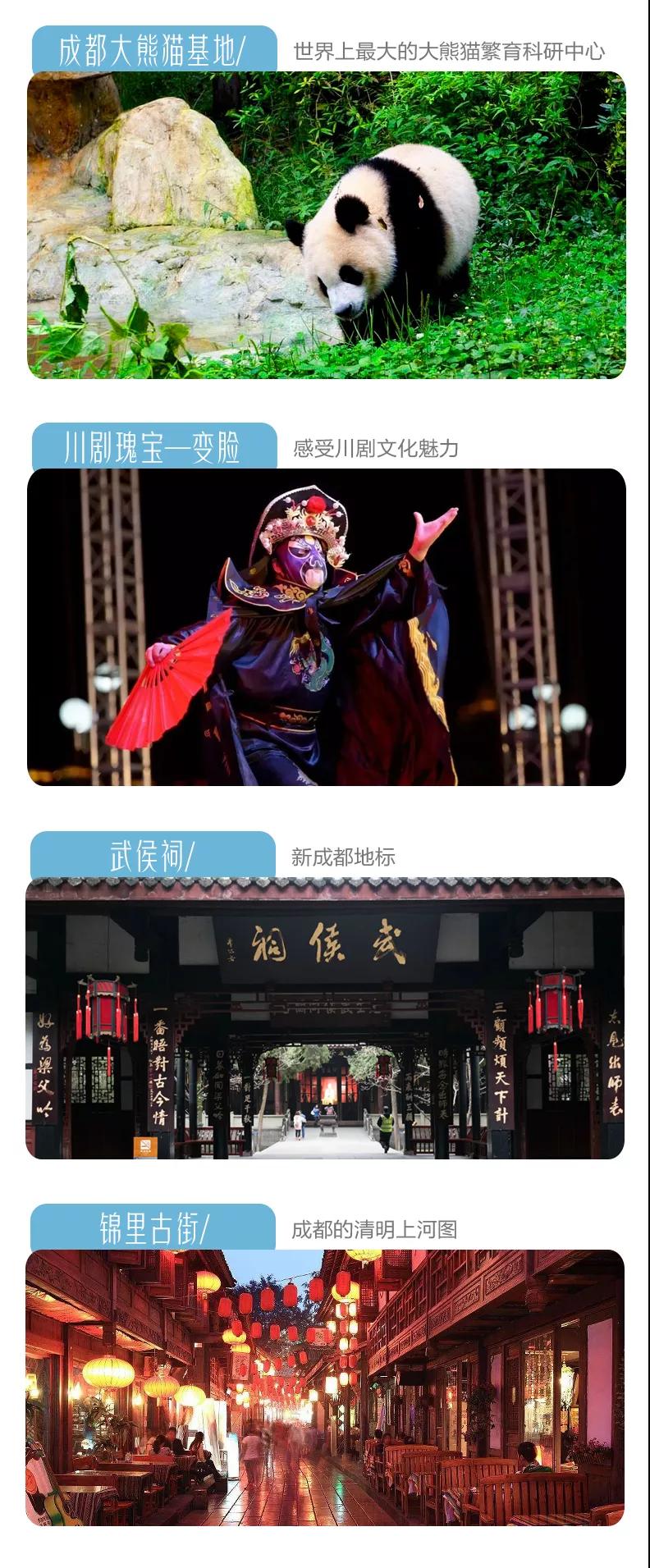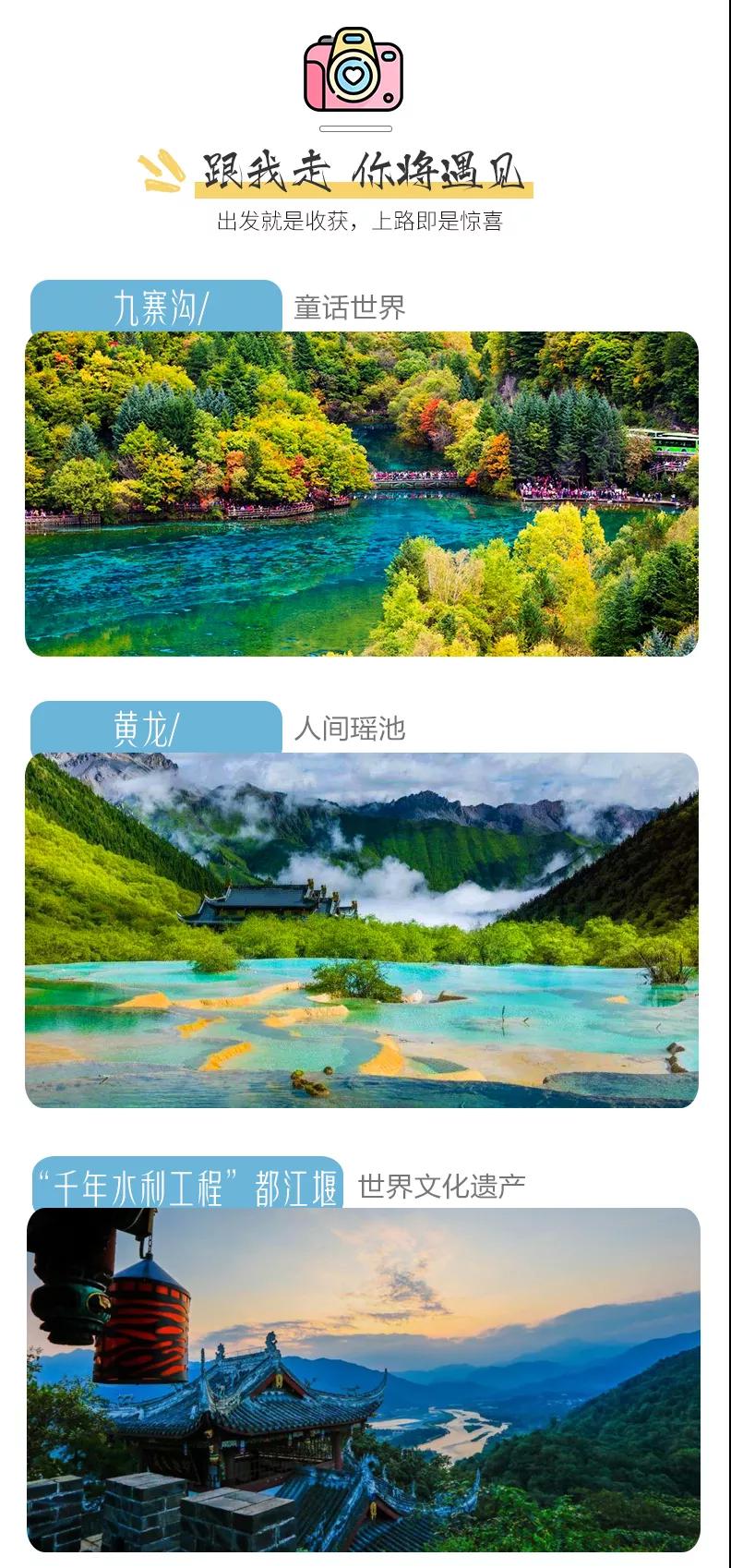 門票:九寨溝門票、黃龍風景區門票、成都熊貓基地門票、武侯祠門票、都江堰門票;