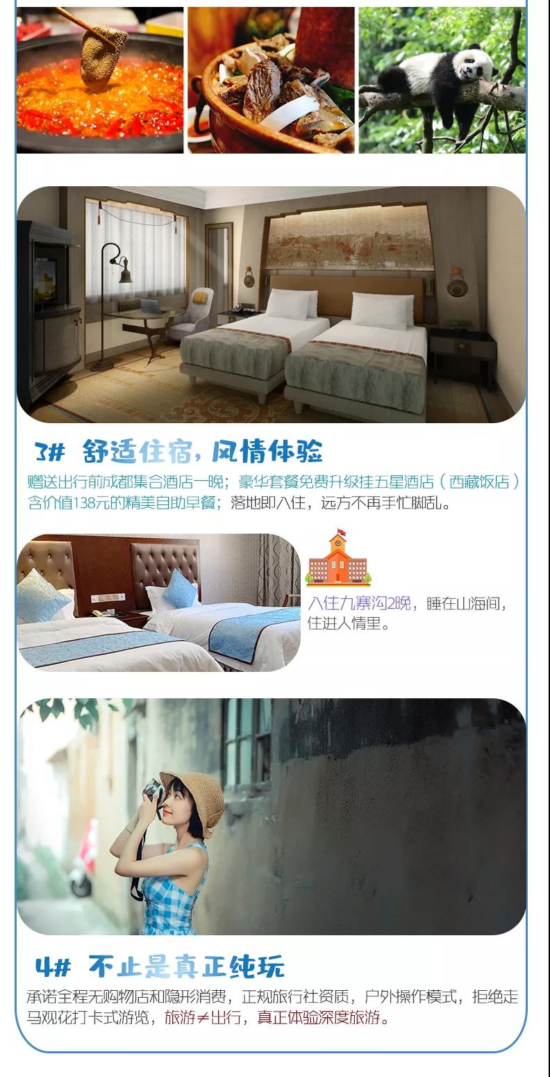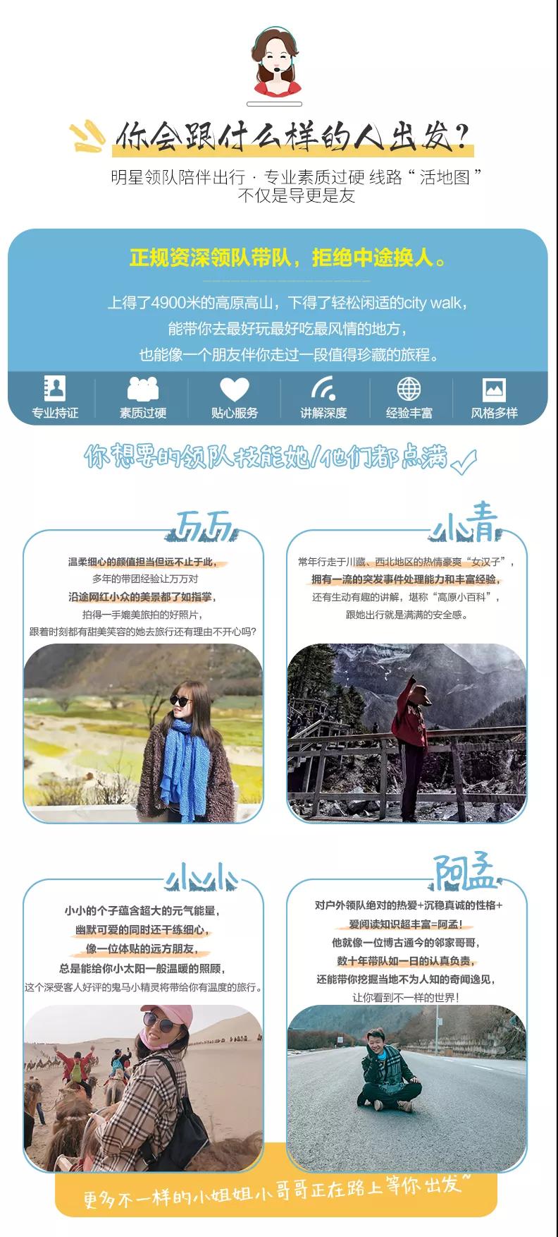 3、九寨溝面積較大游客需求不一,因此主要以游客自助游形式游覽,如無導游陪同望您諒解。游覽開始前導游會與您約定好集合時間,請務必按時到達指定地點,避免耽誤大家接下來的行程;