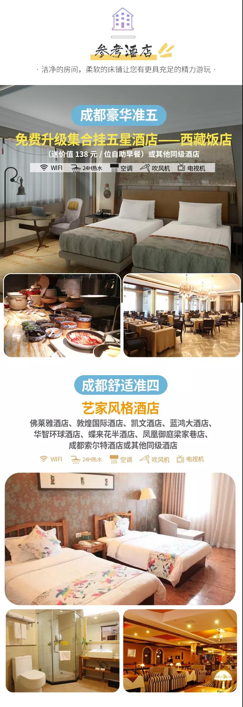 住宿:含4晚住宿;舒適標準全程準四酒店;豪華標準全程準五酒店,免費升級2晚成都掛五星酒店。參考酒店如下: