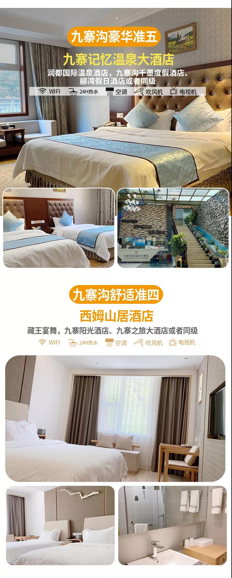 豪華準五:九寨記憶溫泉大酒店,潤都國際溫泉酒店,九寨溝千墨度假酒店、酈灣假日酒店或者同級