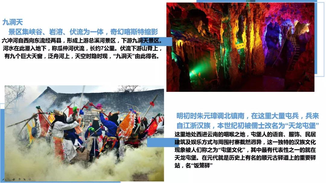 早餐后前往1989年與黃果樹瀑布一道被評為貴州省十大風景名勝區之一的九洞天。九洞天是國務院授予國家級重點風景名勝區之一,是烏江干流六仲河上游流經兩縣之間的一段以伏流(當地人叫陰河)為代表的喀斯特綜合地貌。該段伏流時隱時現,神奇莫測,形成地下河,當地人稱瓜仲河,長約7公里,在下游長約6公里的河段上,箱形切割頂板多處塌陷,形成了大小不同,形狀各異的天窗洞口,使伏流明暗交替,洞洞相連,組合成集伏流、峽谷、洞穴、天橋、天坑、及生物化石為一體的雄奇瑰麗的巖溶大觀。
