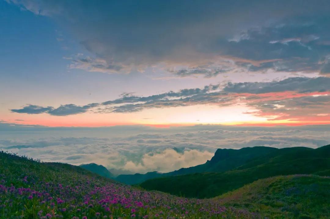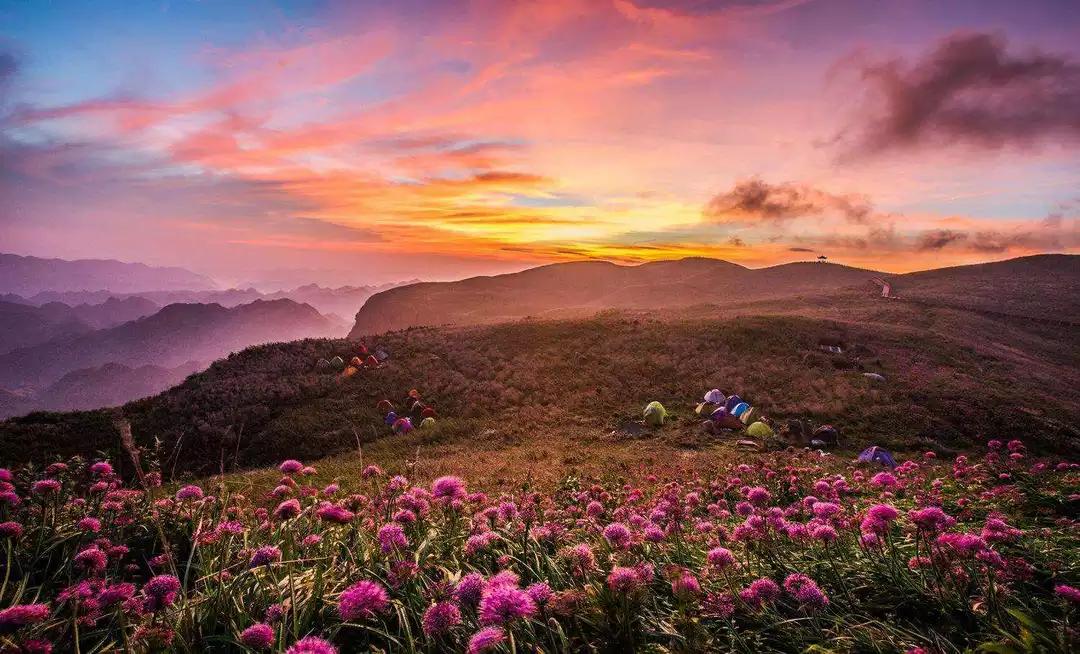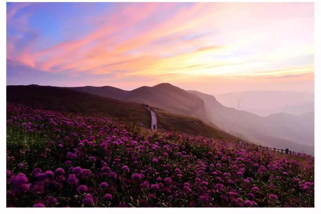 今天我們驅車來到云上花海的韭菜坪山腳下,為了能欣賞到韭菜坪最美的日出景象,我們把重頭戲放到了第二天一早,而今天大家在山下游玩拍照,這里盛開著一望無際紫色的馬鞭草 ,也可以上山去拍一個日落霞光哦。