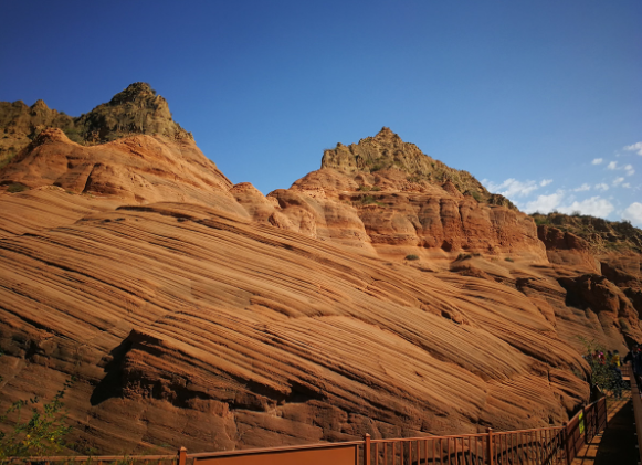 早抵達(dá)延安,導(dǎo)游接站后乘車約2.5小時150公里赴波浪谷景區(qū)走進(jìn)被譽(yù)為中國最美的【波浪谷】自理項(xiàng)目電瓶車50元,一起去感受大自然的鬼斧神工。龍洲紅砂巖位于靖邊縣龍州鄉(xiāng),是由紅色的砂巖構(gòu)成的特殊丹霞地貌,在長期的風(fēng)力和雨水的沖刷下形成溝壑、波浪起伏的山丘狀,因砂巖上的紋路像波浪,人稱“波浪谷”。遠(yuǎn)遠(yuǎn)望去,這些紅色石頭就像泥石流一樣呈現(xiàn)出一種流水狀,一圈圈、一彎彎的向溝壑中涌去,好像滔滔的黃河,洶涌奔騰,也有人把這里譽(yù)為”中國的科羅拉多”。靖邊波浪谷巖石學(xué)術(shù)上被稱為“砒砂巖”,成于古生代二疊紀(jì)和中生代三疊紀(jì)、侏羅紀(jì)、白堊紀(jì)之間。這是地球歷史中地質(zhì)最活躍、生物最繁茂、動物最龐大的時代。砒砂巖像綻放的罌粟花般美麗,壯觀,誘人,無水堅(jiān)硬如石,遇水松軟如泥。