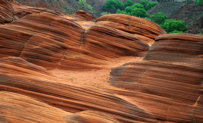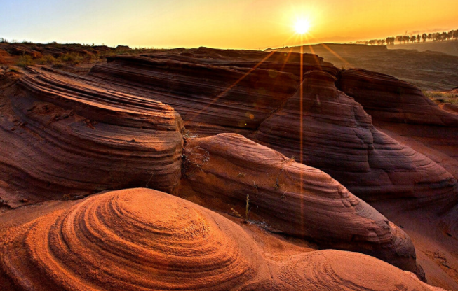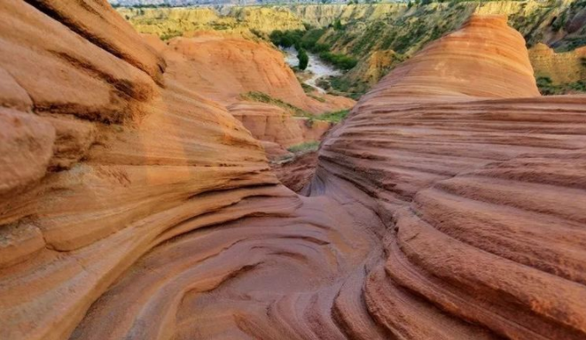 波浪谷展示的是由數(shù)百萬年的風(fēng)、水和時間雕琢砂巖而成的奇妙世界。層層疊疊的石頭就像一大批鋪蓋在地面上浸染過后晾曬的紅色布匹,一層層、一卷卷、一盤盤在夕陽的渲染之下,異常的鮮紅; 與溝底一處處流淌細(xì)小的河水和遠(yuǎn)處覆滿綠色植被山頂上轉(zhuǎn)動的風(fēng)車構(gòu)成了一幅優(yōu)美的實(shí)景畫。