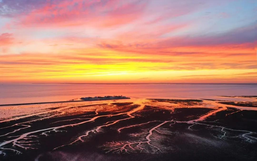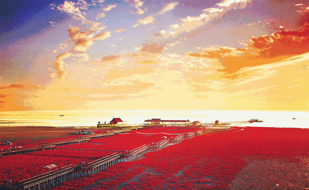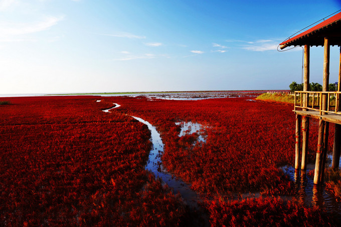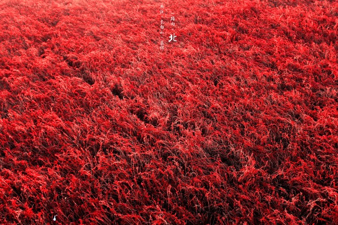 紅海灘位于遼寧省盤錦市渤海灣的東北部,地處遼河三角洲濕地內,是國家級自然保護區。這里的海灘之所以呈現出紅色,其實是因為海灘上生長堿蓬草是一種可以在鹽堿土質上存活的草。每年四月,堿蓬草長出地面,初為嫩紅,漸次轉深,秋季由紅變紫。堿蓬草不要撒種,無須耕耘,在鹽堿鹵漬里,年復一年地生長,造就了這一奇觀。盤錦的紅海灘每年以50米的速度向大海延伸,始終追趕著海浪的蹤跡。
