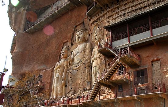 麥積山石窟屬全國重點文物保護單位,建自公元384年,后來經(jīng)過十多個朝代的不斷開鑿、重修,遂成為我國著名的大型石窟之一,也是聞名世界的藝術(shù)寶庫。麥積山石質(zhì)皆為紫褐色之水成巖,其山勢陡然起獨峰,最初有許多天然之巖洞。它的海拔1742米,山頂距地面142米,現(xiàn)存洞窟194個,其中有從4世紀到19世紀以來的歷代泥塑、石雕7200余件,壁畫1300多平方米。由于麥積山山體為第三紀沙礫巖,石質(zhì)結(jié)構(gòu)松散,不易精雕細鏤,故以精美的泥塑著稱于世,絕大部分泥塑彩妝。被雕塑家劉開渠譽為“東方雕塑陳列館”。它的開鑿年代,大部分學(xué)者認為始于后秦,歷經(jīng)北魏、西魏、北周、隋、唐、五代、宋、元、明、清歷代都有不斷地開鑿和修繕,現(xiàn)存造像中以北朝造像原作居多。麥積山石窟的一個顯著特點是洞窟所處位置極其驚險,大都開鑿在懸崖峭壁之上,洞窟之間全靠架設(shè)在崖面上的凌空棧道通達。游人攀登上這些蜿蜒曲折的凌空棧道,不禁驚心動魄。古人曾稱贊這些工程:“峭壁之間,鐫石成佛,萬龕千窟。碎自人力,疑是神功。”附近群眾中還流傳著“砍完南山柴,修起麥積崖”,“先有萬丈柴,后有麥積崖”的諺語。可見當(dāng)時開鑿洞窟,修建棧道工程之艱巨、宏大。