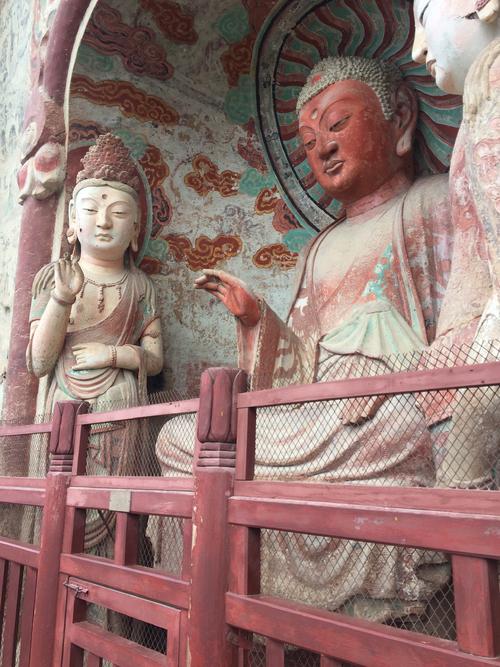 麥積山的洞窟很多修成別具一格的“崖閣”。在東崖泥塑大佛頭上15米高處的七佛閣,是我國典型的漢式崖閣建筑,建在離地面50米以上的峭壁上,開鑿于公元6世紀中葉。麥積山石窟雖以泥塑為主,但也有一定數(shù)量的石雕和壁畫。麥積山石窟被列為國家重點文物保護單位,新架和修復(fù)了1300多米的凌空棧道,使游人能順利登臨所有洞窟。麥積山石窟的造像最高大者達16米,最小者僅為10余厘米。其中第44窟造像被日本人稱為“東方的維納斯”。西秦的78窟 、128窟的造像的僧衣細致地繪出了圖案。建于七十余米高的的七佛閣上塑像俊秀,過道頂上殘存的壁畫精美絕倫,其中西端頂部的車馬行人圖,無論從哪個角度看車馬所走方向均不相同,堪稱國內(nèi)壁畫構(gòu)圖之經(jīng)典之作。