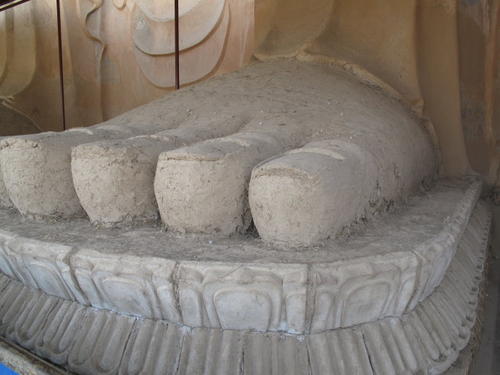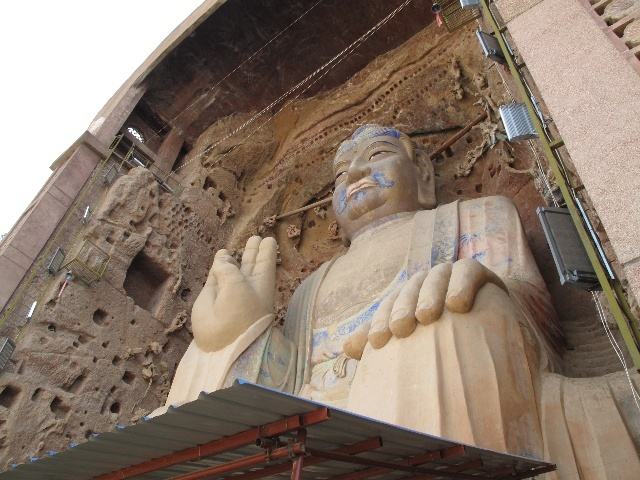 甘谷大佛石窟造象可遠溯至北魏,具體年代已經(jīng)無從稽考。現(xiàn)存釋迦牟尼大佛像始鑿于北魏,一直到盛唐才趨完美。大佛石胎泥塑,身高23.3米,腰闊10.4米,結(jié)跏跌坐于蓮座之上,高大魁梧,溫順善良,坐于30.2米高、窟頂呈圓拱形的石窟內(nèi),頤面豐滿,肉髻高突,兩耳下垂,頸短并飾三道弦紋,短須作蝌蚪狀,施拔濟眾生印,足踩豐蓮。窟內(nèi)還殘存懸塑達摩、頻伽、飛天、卷云、蓮葉等,栩栩如生。