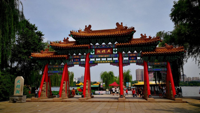 南門牌坊,大明湖南門,為一民族形式的牌坊。1952年由濟南府學文廟遷此。原為木結構,1984年改為混凝土木結構,樣式依舊。五間七彩重昂單檐,飾有吻獸。坊頂黃色琉璃瓦覆蓋,檐下云頭斗拱承托,額枋彩繪“旭日云鶴”、“金龍戲珠”、“西番蓮”等圖案。匾額上書“大明湖”三個鎏金大字。12根斜柱支撐著三階式錯落的坊頂,柱礎由石鼓夾抱。整個建筑金碧輝煌,宏偉壯觀,被視作大明湖的標志。牌坊西側,立有清嘉慶十六年(1811年)《大明湖》石碑,為登州(今蓬萊)于書佃手筆。牌坊匾額“大明湖”三字,即依該碑字跡刻成。牌坊兩側,門房對稱,歇山卷棚,上覆綠色琉璃筒瓦,顯得玲瓏典雅。房前架雕欄小石橋,橋下各有石砌小溪。珍珠、濯纓等清泉經此溪注入大明湖。坊內設碼頭,柳浪垂蔭,畫舫停泊,往來渡客。