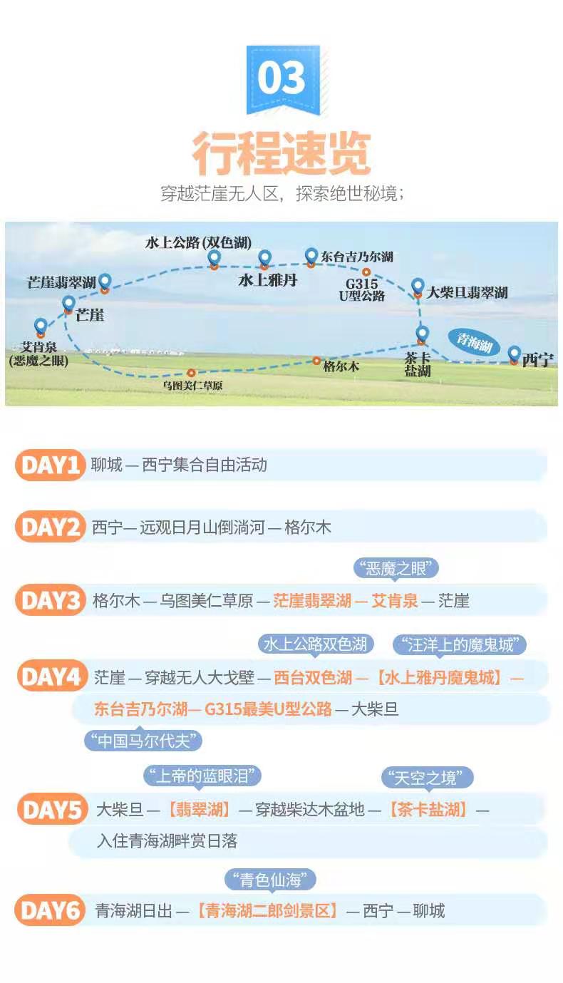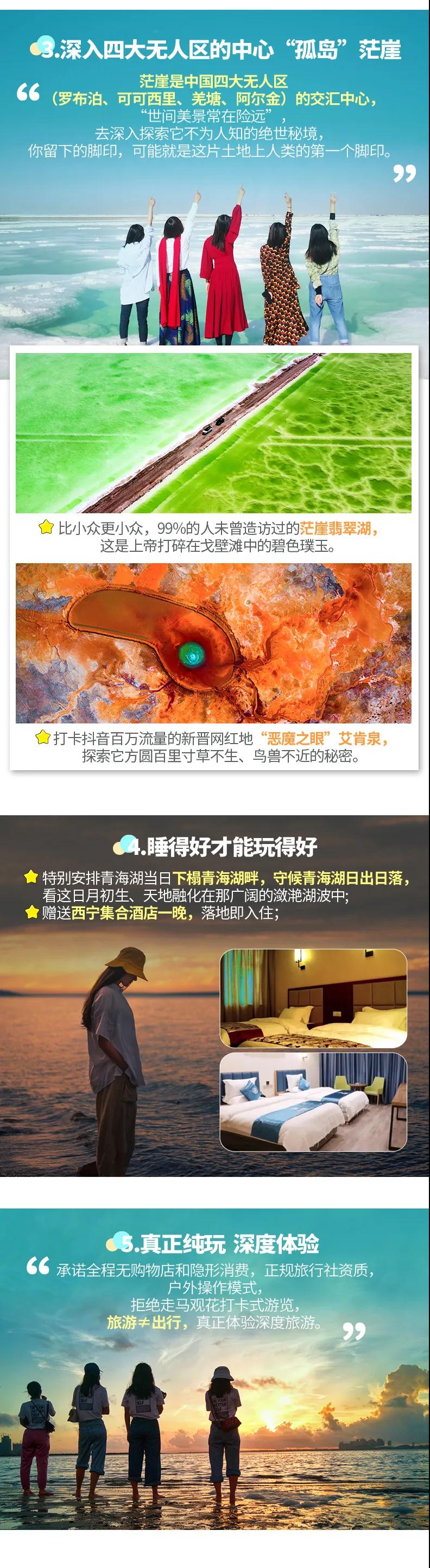 (5)茫崖翡翠湖、東/西臺吉乃爾湖、艾肯泉為小眾未開發(fā)景點,往年不設(shè)門票,若今年收費門票或環(huán)保費由游客自理。