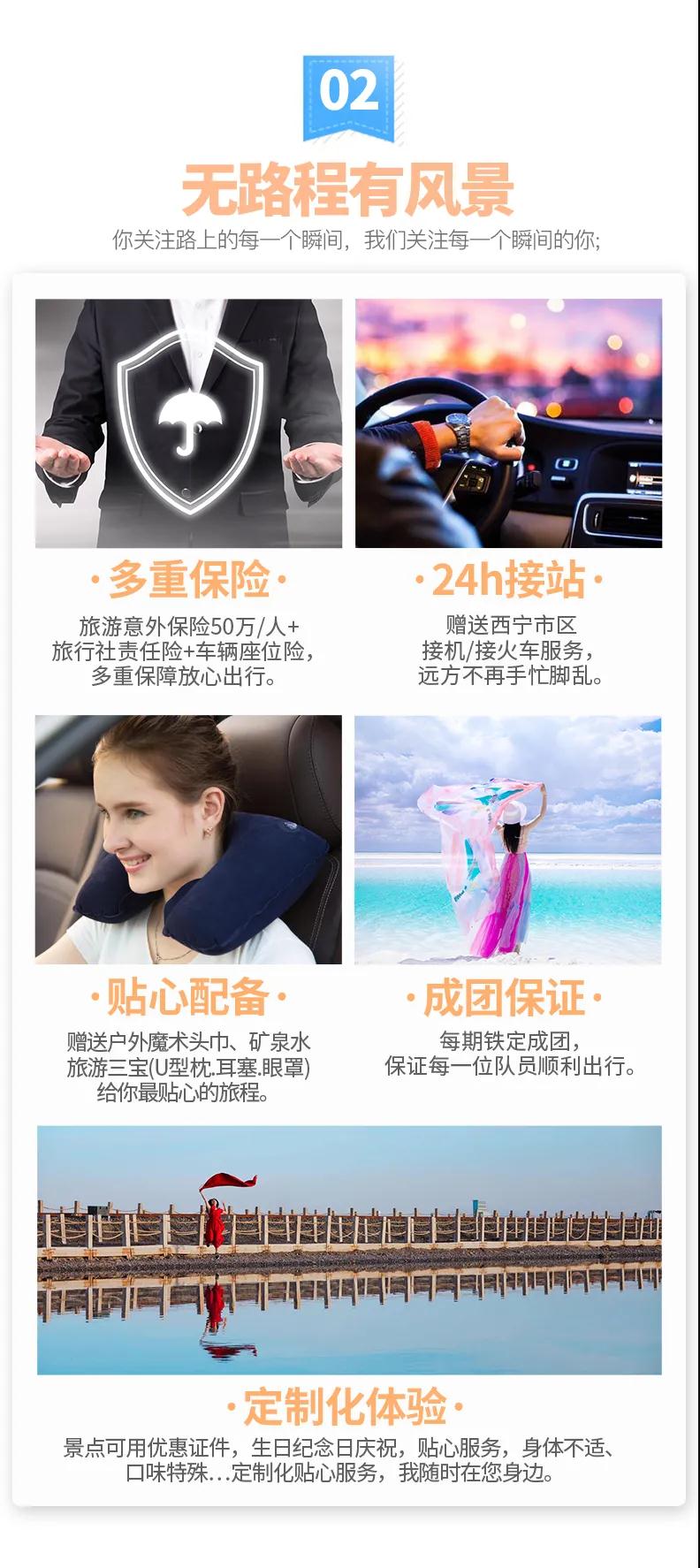 5、贈送:贈送西寧市區(qū)24小時接機/接火車服務(wù);贈送戶外魔術(shù)頭巾、旅游三寶(頸枕耳塞眼罩)、礦泉水。(贈送項目不用費用不退)