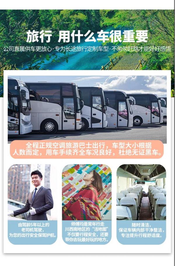 1、關于車輛交通:目前四川旅游市場8座以下車輛無法辦理旅游牌照,請游客知悉,以此理由提起的投訴我方拒不受理,望您諒解。