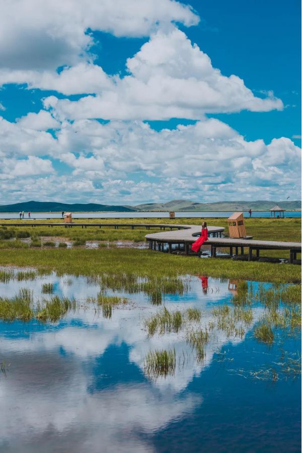 然后我們前往草原湖泊【若爾蓋花湖】,花湖湖面遼闊,水下是深不可測的沼澤地,在陽光的照耀下,水面反射出不同的光彩,攝人心魄。湖邊是大片茂密的蘆葦叢,隨微風拂動,越發映襯出湖面的寧靜與滄桑。花湖最漂亮的時候是每年夏天,草地上開滿了五顏六色的花朵,極為漂亮。廣闊的草原一片碧綠,藍色的花湖被一片綠色包圍,仿佛綠色地毯上的一顆藍寶石,美輪美奐。湖邊建有木質棧道,一直延伸到水中,可以沿著棧道走到濕地深處,沿途都可以找到拍大片的好角度。花湖是眾多野生飛禽的主要棲息地,湖面上游弋著黃鴨、斑頭雁、天鵝、黑頸鶴等珍稀動物,還有高原魚類和其他珍稀動物。坐在湖邊或者棧道上的亭子里,常有黑頸鶴從湖面上掠過。