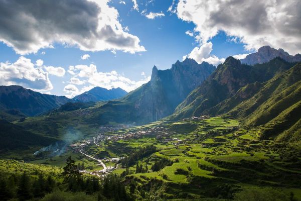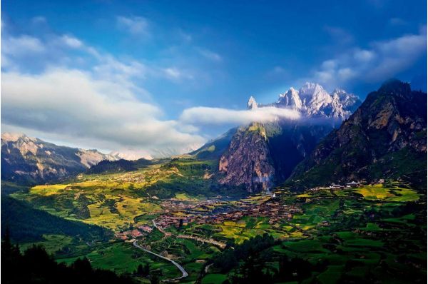 甘肅省迭部縣益哇鄉“扎尕那”是藏語,意為“石匣子”扎尕那山位于迭部縣西北34公里處的益哇鄉境內,是一座完整的天然“石城”俗有“閻王殿”之稱。地形既像一座規模宏大的巨型宮殿,又似天然巖壁構筑的一座完整的古城。正北是巍峨恢弘、雄偉壯觀、璀璨生輝的光蓋山石峰,古稱“石鏡山”因灰白色巖石易反光而有其名;東邊聳峙壁立的俊俏巖壁,凌空入云,云霧繚繞;南邊兩座石峰拔地而起,相峙并立成石門;再南至東哇、納加一帶,峭壁矗立,清流跌宕,水磨飛輪,流轉不息。山勢奇峻、景色優美,猶如一座規模宏大的石頭宮殿,這片世外桃源雖然早在近百年前就被洛克譽為亞當和夏娃的誕生地,但至今仍是一塊處女地。