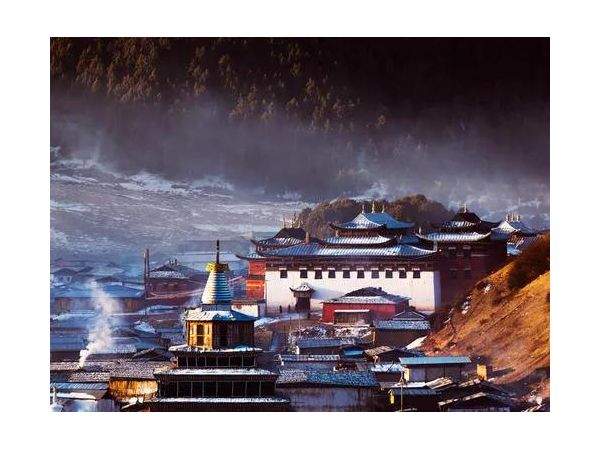 朗木寺最美的是清晨,小鎮被薄霧和炊煙籠罩,遠處朝陽的光彩映在郎木寺的紅色礫巖上,佛塔、清真寺和民房的屋頂都呈現出溫暖的光澤,整個小鎮就洋溢著一種淡淡的卻又揮之不去的恬靜與親和。