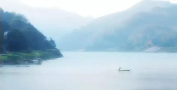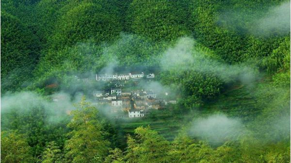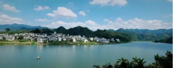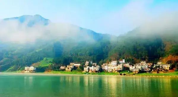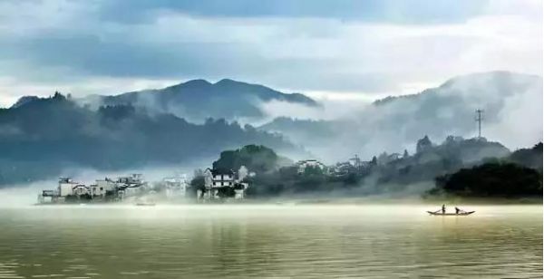 兩岸青山,青翠碧綠,形狀各異,江邊古色古香的徽州人家藏匿于青山中,粉墻黛瓦,煙霧裊裊。
