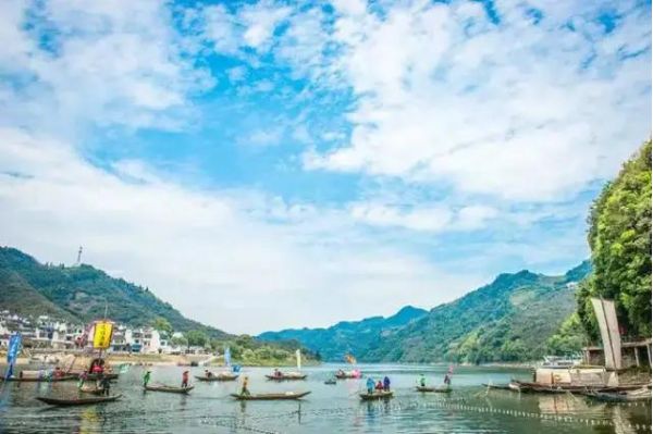 7:00準時集合出發,約8:30到達深渡碼頭,乘坐畫廊游船,這是一條聞名中外的“唐詩之路”,今有“山水畫廊、清涼世界”的美譽。它像一條閃閃發亮的銀練,穿行于錦峰秀嶺、山鄉古建筑之間。兩岸點綴著粉墻黛瓦的徽派建筑,當清晨晨霧縈繞抑或傍晚炊煙裊裊之時,頗有中國水墨山水畫的味道。