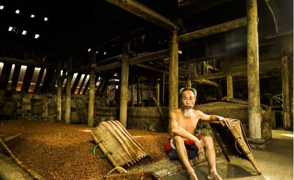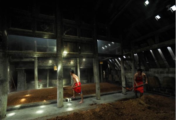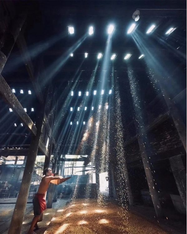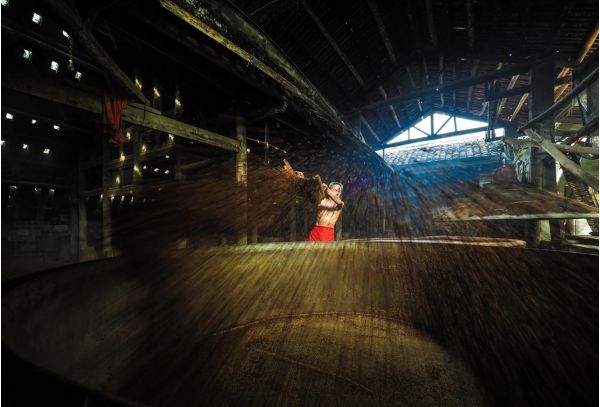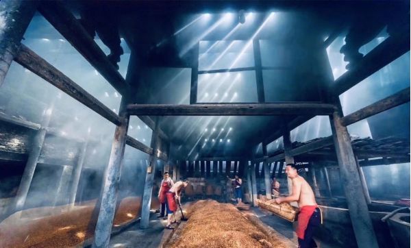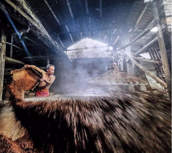 拍攝有著百年歷史的傳統手工藝—泡子酒,迎合著紅高粱霧蒙蒙蒸汽,仿佛置身于行宮騰云般壯觀??揪茙煾祩兌酥圃愦┧笮凶?,或激情揮灑酒曲之間,所到之處,散發著一種勞動之美,力量之美。將近午時光束穿透老屋頂,投射到古老的作坊,這里便是暈染了熱騰騰的場景。