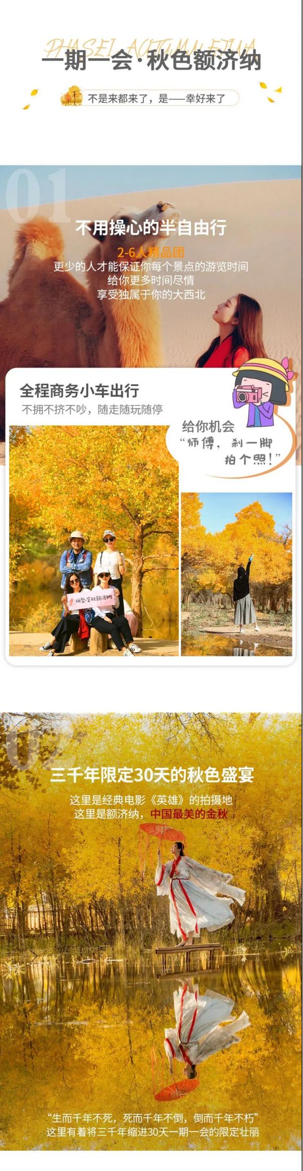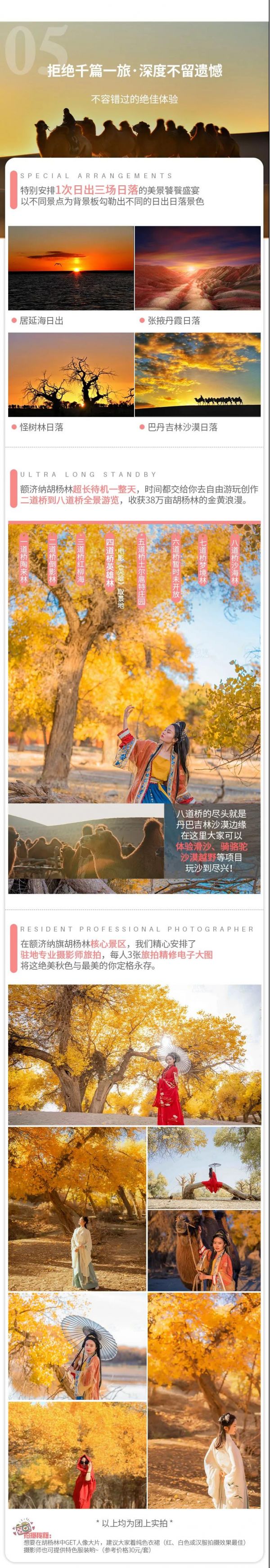 在額濟納旗胡楊林核心景區,我們還精心安排了駐地專業攝影師旅拍,每人至少3張旅拍精修電子大圖,將這絕美秋色與最美的你定格永存。