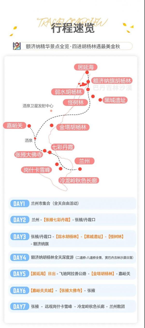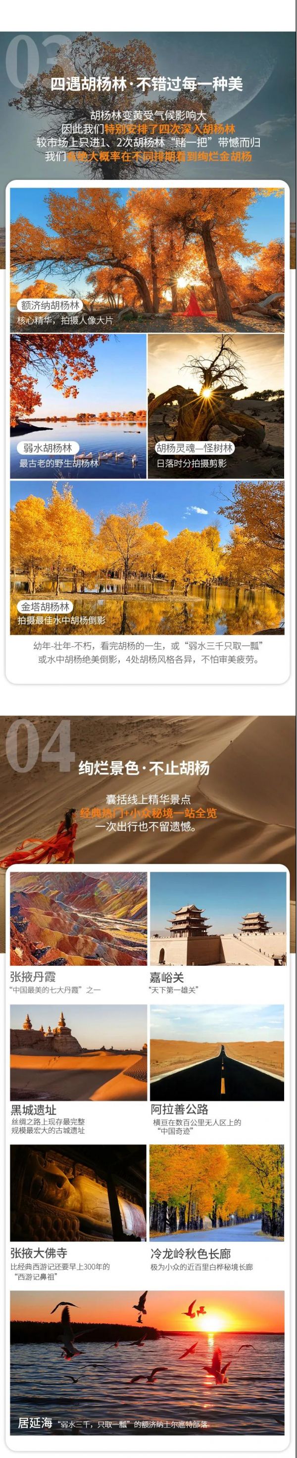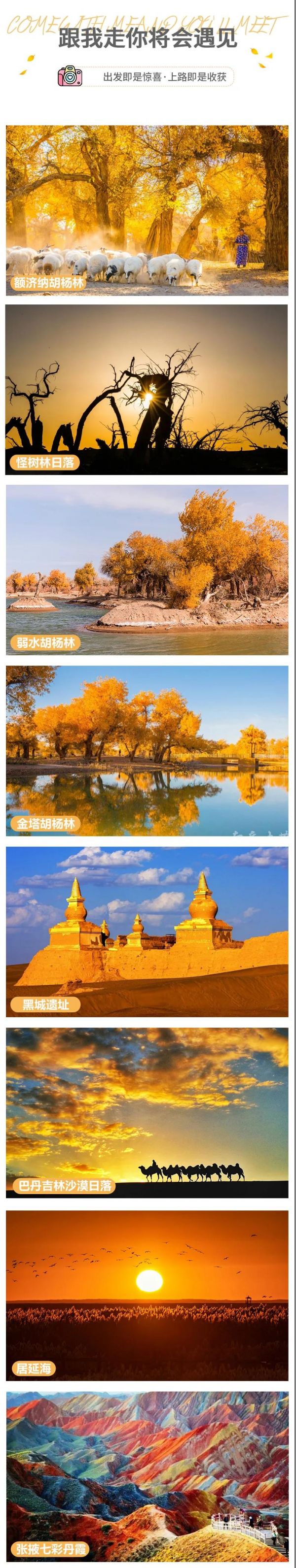 額濟納胡楊林+冷龍嶺秋色長廊+金塔胡楊林+弱水胡楊林+怪樹林+七彩丹霞+居延海日出+沙漠日落+張掖大佛寺+嘉峪關城樓+阿拉善公路+黑城遺址