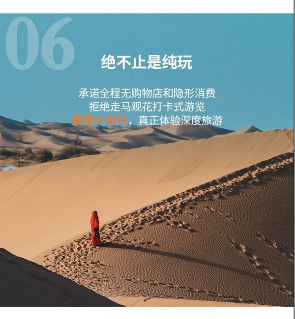5、甘肅及額濟納旗環境受限,當地酒店及餐飲條件無法與城市相比,請游客做好心理準備;賓館內可能無牙膏牙刷、拖鞋等一次性衛生用品,請自備個人衛生用品;沿途商店較少,民俗習慣亦有不同,游客可自備咸菜、小吃、干糧等零食,以備不時之需。