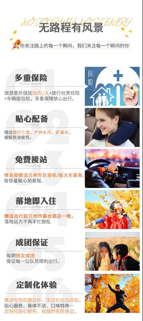 3、贈送:貼心禮包戶外百變魔術頭巾防曬防沙+旅游三寶緩解乘車疲勞+每人每天一瓶礦泉水;贈送蘭州市區接機/接火車服務(23點后由于運管規定不能接機/接站);項目不用不退,望您諒解。