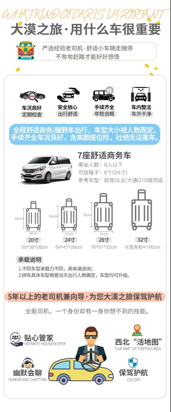 1、交通:2-6人VIP私享小團,全程舒適商務車出行,保證一人一正座位,且由駕駛經驗豐富的司機為您的出行保駕護航,報價包含車費、油費、停車費、維修費及司機勞務費。