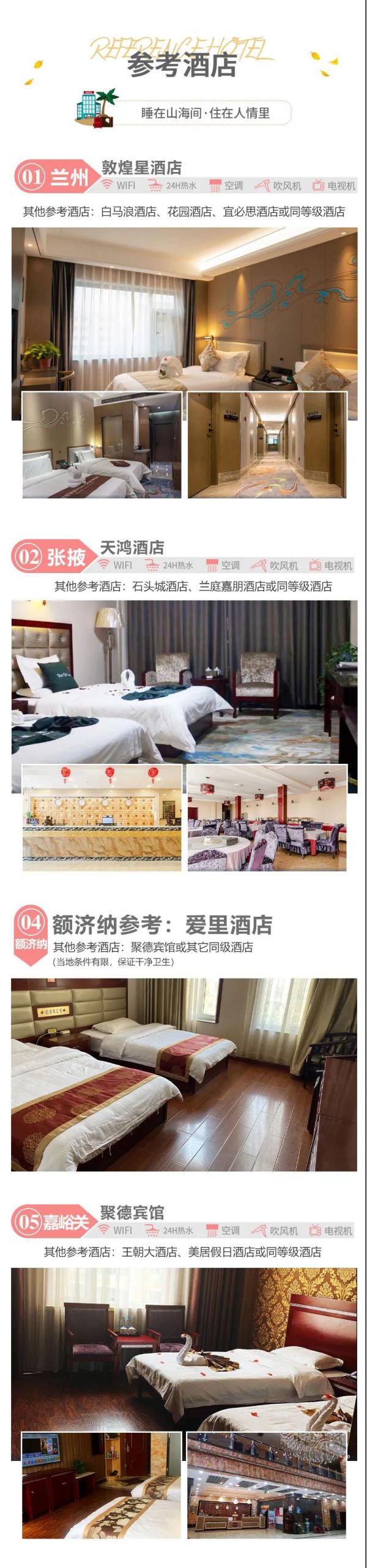 2、住宿:蘭州、嘉峪關、敦煌、張掖入住當地準四酒店,免費升級1晚張掖當地準五酒店,額濟納入住舒適干凈雙人標間;西北經濟條件有限,酒店不如南方地區,如未達到您的預期,望您諒解。