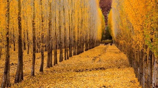 然后我們會車觀一條極為小眾的秘境長廊——【冷龍嶺秋色長廊】,我們已經見識過沙漠與胡楊林交接的壯美,但卻不知秋季的白樺林也美得不可方物。每至9-10月的秋季,長達80里的冷龍嶺就會變成層林盡染的金色白楊白樺長廊,穿行其中,視野開闊,兩道皆是白樺林,碩果搖金,層林盡染,繁華似錦,牛羊間或鑲嵌其間,猶如一幅絢爛的油畫。
