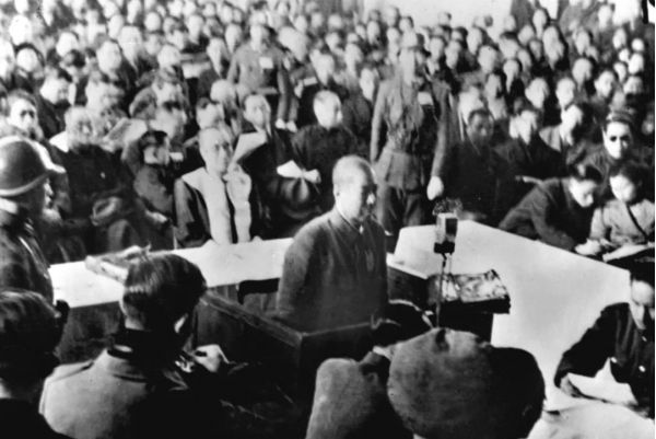 這是抗日戰爭勝利后,制造南京大屠殺的主要罪犯、日軍第6師團師團長谷壽夫被押上審判臺并被處死刑。