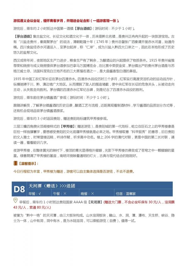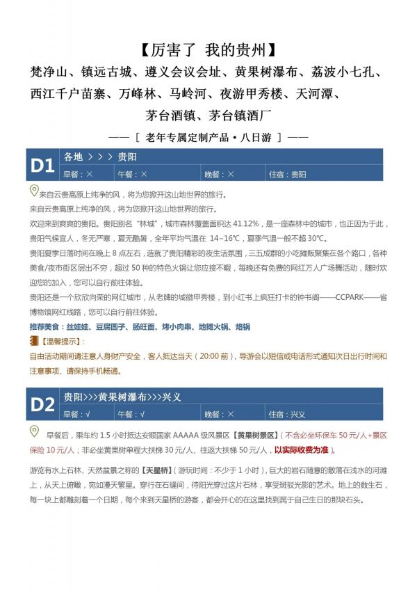 貴州8日游 聊城發(fā)團(tuán) 純玩 無購物 凈山 鎮(zhèn)遠(yuǎn)古城 遵義會議會址 黃果樹瀑布 荔波小七孔 江千戶苗寨 萬峰林 馬嶺河 夜游甲秀樓 天河潭 茅臺酒鎮(zhèn) 茅臺鎮(zhèn)酒廠 發(fā)團(tuán)時間 20230615-20230622 價格 4480 報名電話 0635 8681234