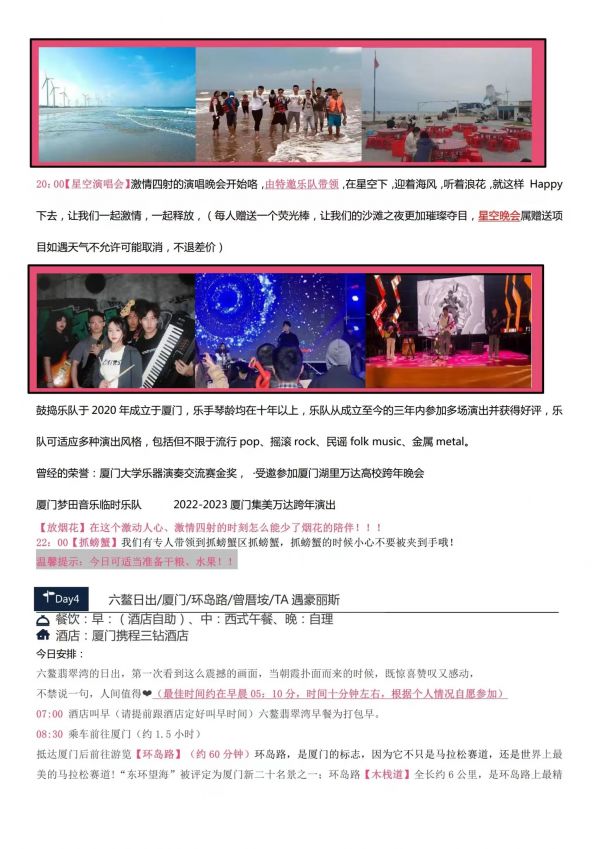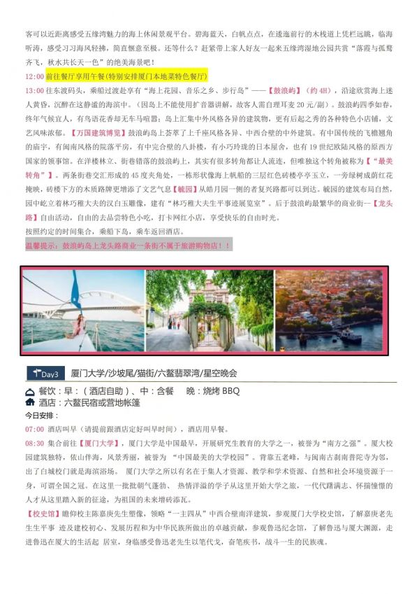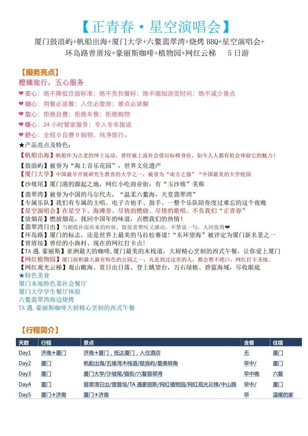 廈門-星空演出雙飛5日游 聊城發團 純玩 無購物 廈門鼓浪嶼 帆船出海廈門大學 星空演唱會六鰲翡翠灣 環島路曾厝垵 科技館 八市網紅植物園 ...... 發團時間 20230621-20230625 20230628-20230702 價格 4190 報名電話 0635 8681234